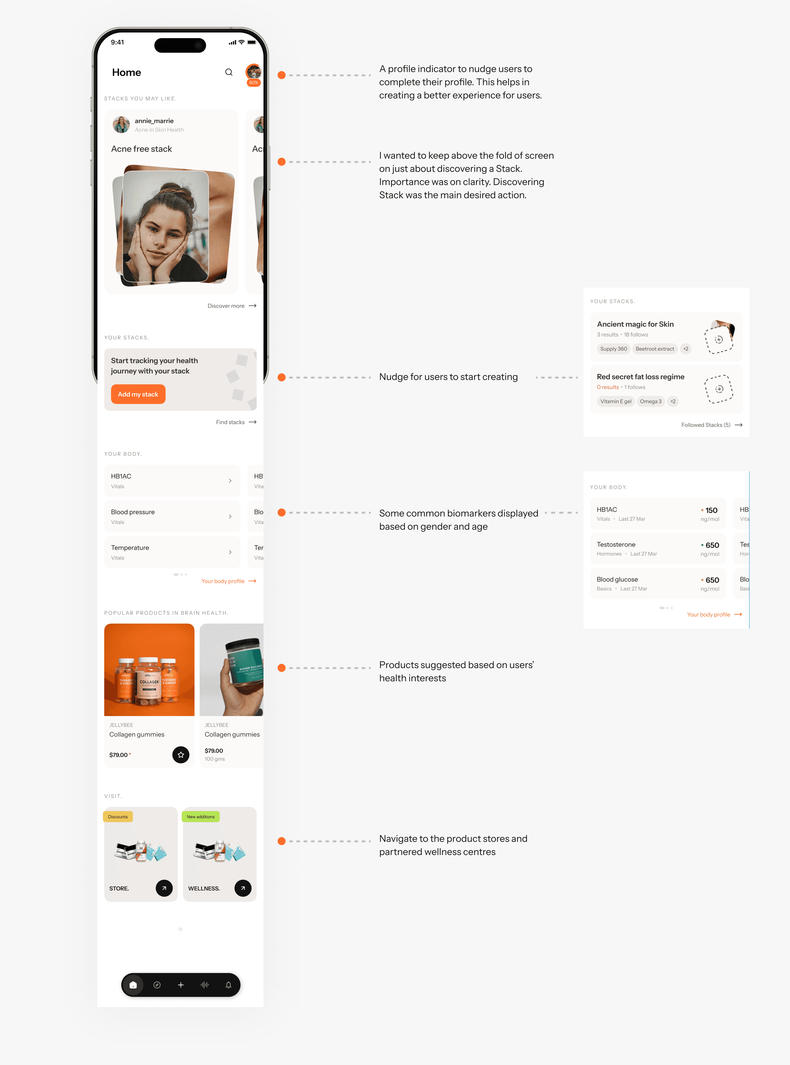The Store was the feature that would be the main financial model of the platform. The products on the store would either be affiliate or partner brands. The suggestions would be made based on user's data and their Stacks or the supplements they already use.