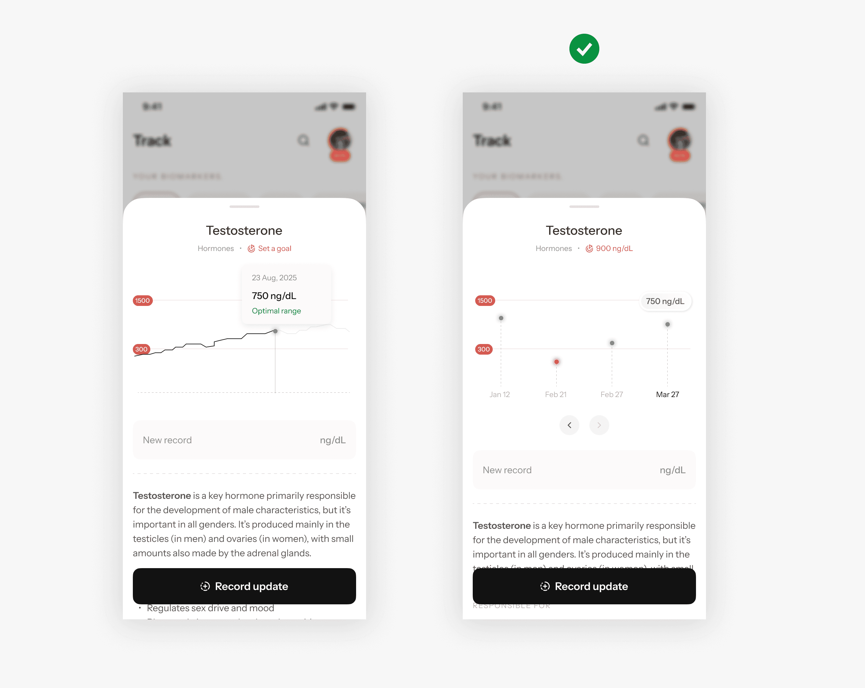 A big consideration here was understanding what users do. So we went to one of the best wellness centres in Bali, The Omni and we researched. People tested their health biomarkers every quarter to measure and track their body improvements. So I had a clear winner in this dilemma, the discrete dataset visualization.