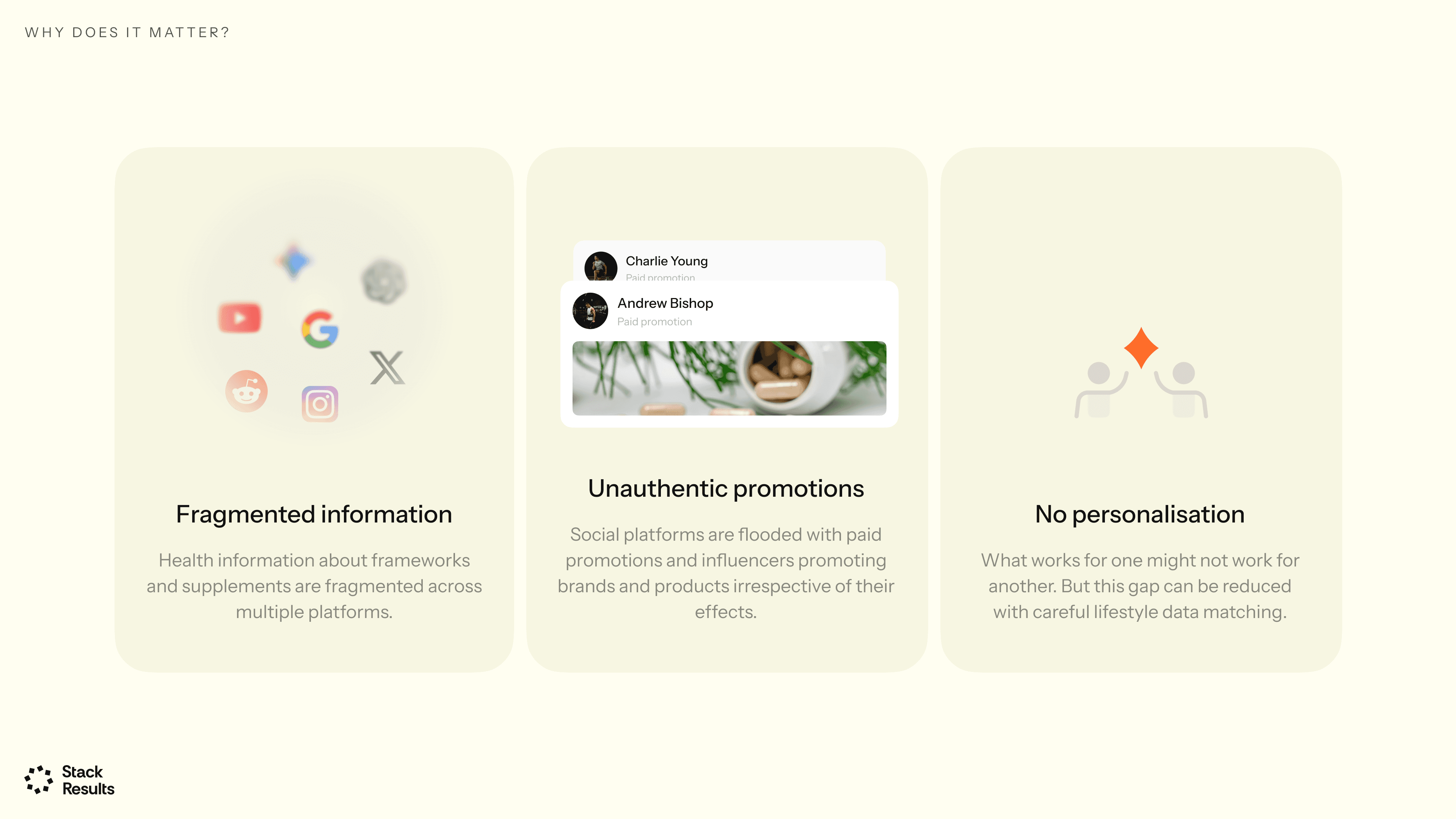 Stack Results serves the modern health-seeker — individuals who are health-conscious but overwhelmed by fragmented information and influencer overload. Our users crave personalized, data-backed solutions and trust people like them over paid promotions.