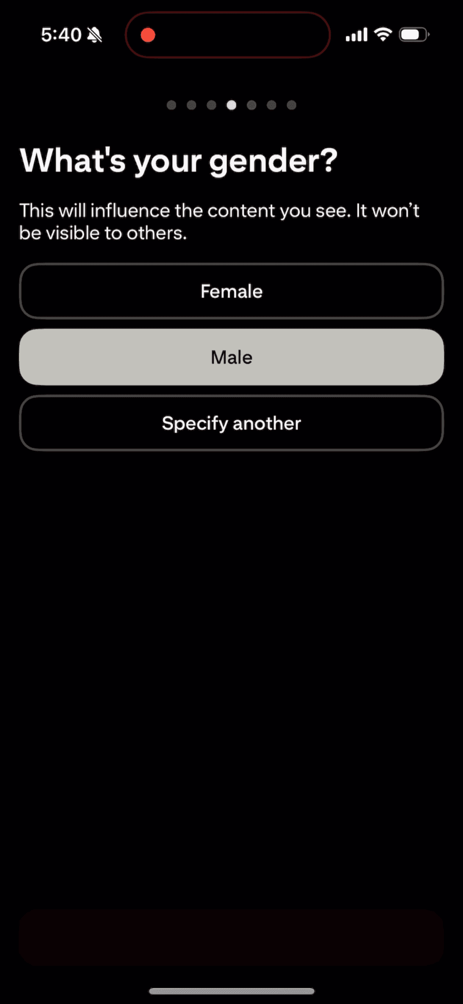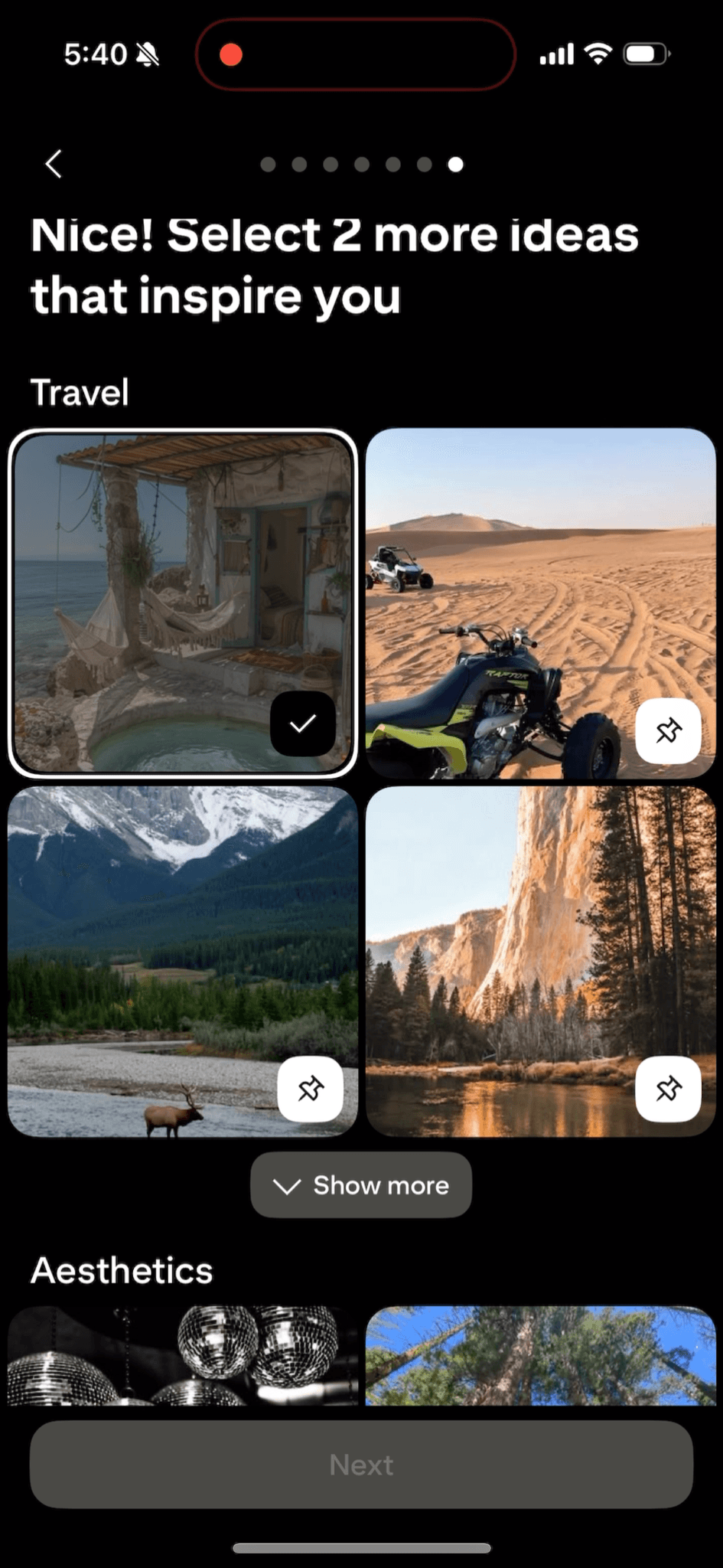 Further, the preferences are sub categorized. But why specifically 3? By design, user is given a goa to accomplish - find and select three pictures. It changes the thoughts of the moment from "let's just skip this and get to what the app does" to "which 3 pictures do I like here?"