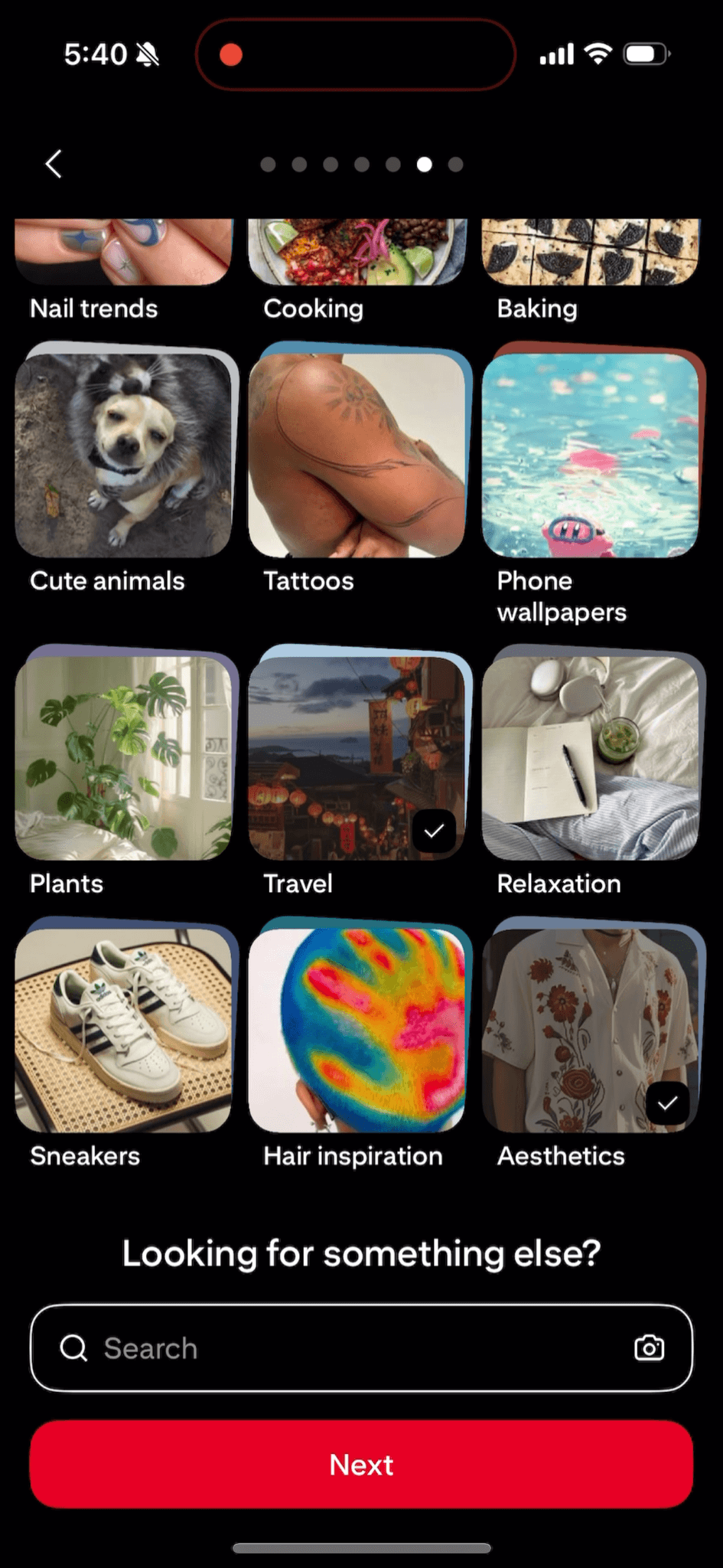 Sets the preference using visual stimuli. They could have used text based pills too but they designed it to be more visual, like Pinterest is, and so the preferences are more accurate. Also gives user the flexibility to search something else.