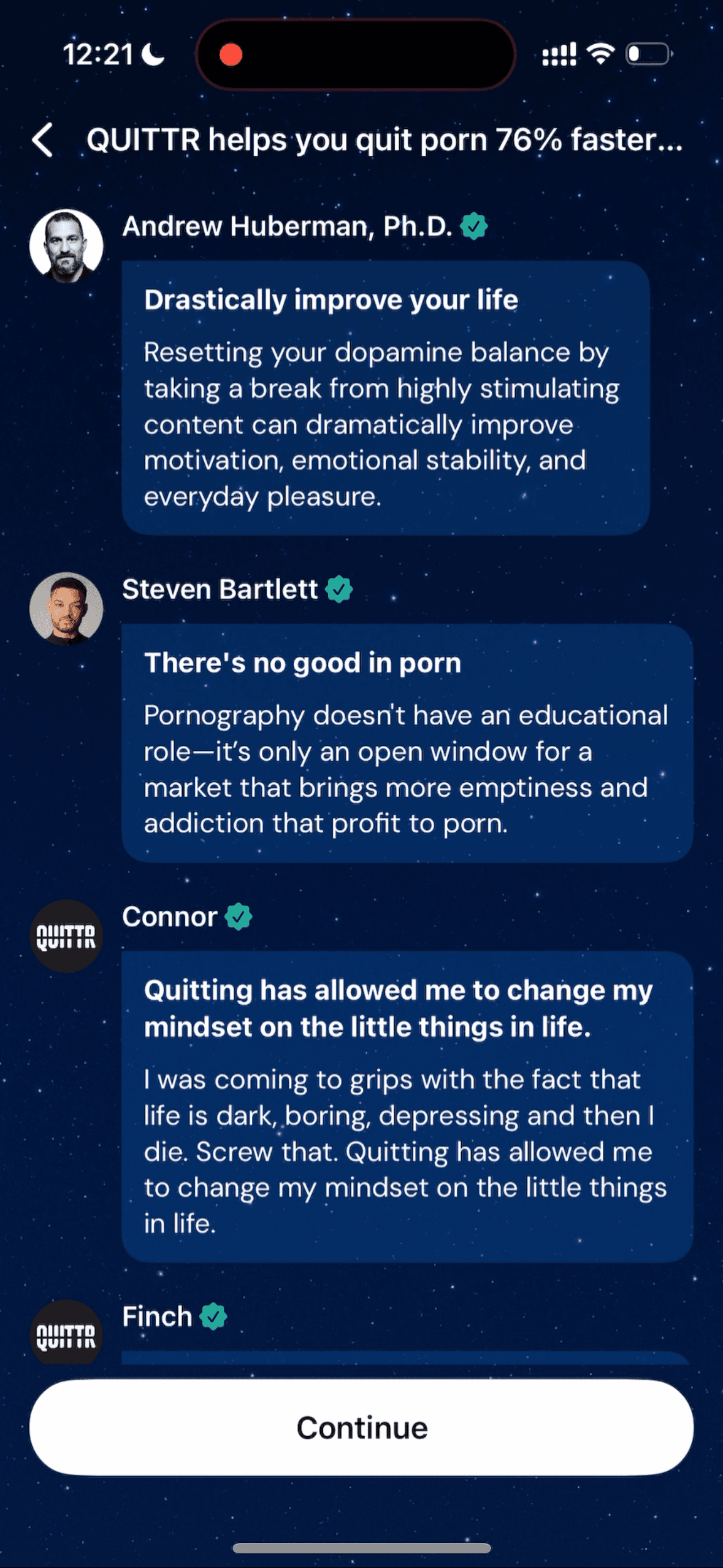 Notice the small things here which play a huge part in storytelling. The button copy says "Become a QUITTR", associating the user with a larger movement, a calling. This is the best core drive in gamification.