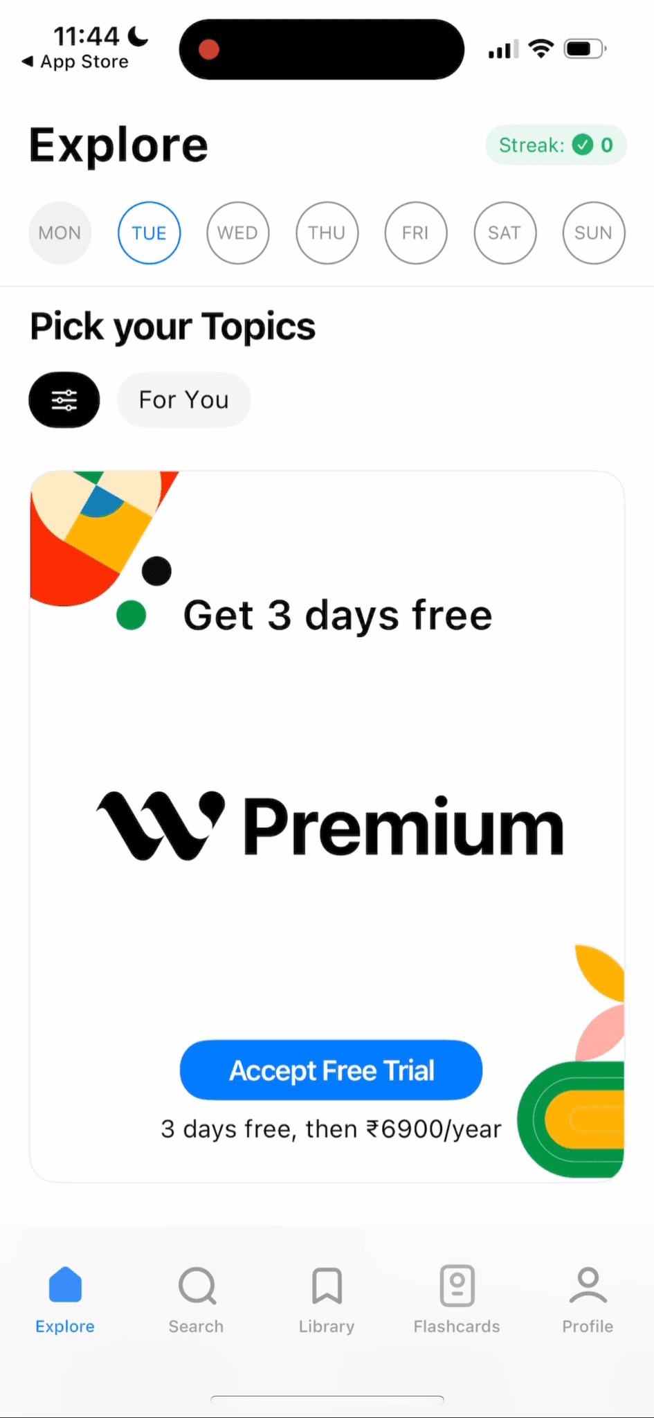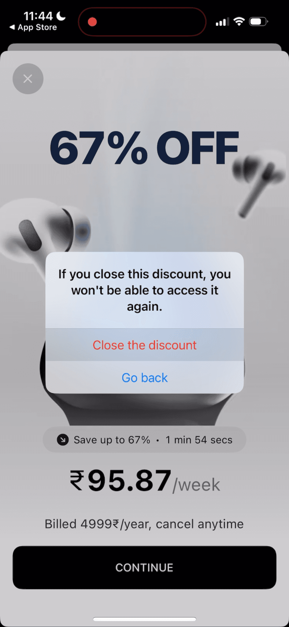 On cancelling the free trial, the app immediately throws a huge discount and even breaks it into price per week so make it appear a small amount. It also creates extreme scarcity by putting a 2 mins timer before the discount disappears (but it actually doesn't, they email you again ;)).